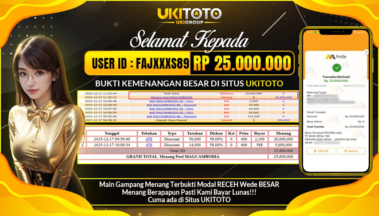 Selamat kepada User id : FAJXXXS89 Telah berhasil mendapatkan kemenangan besar pada permainan JACKPOT TOGEL PASARAN MAGCAMBODIA POOLS Rp.25,000.000, Setelah mengisi formulir withdraw dengan kurung waktu hanya 5 – 10 menit pihak UKITOTO sudah melakukan transfer kepada pemilik Userid dan dana sudah dapat di cairkan oleh pemenang. Bukti pembayaran yang kami berikan merupakan bukti pembayaran yang SAH / VALID yang langung di dapatkan melaui tanda transfer transaksi dari Bank yang di tuju. Kami mengucapakan banyak Terima Kasih Kepada pemenang karena sudah mempercayakan kami sebagai Bandar Tepercaya yang membayar semua kemenangan member hingga lunas.