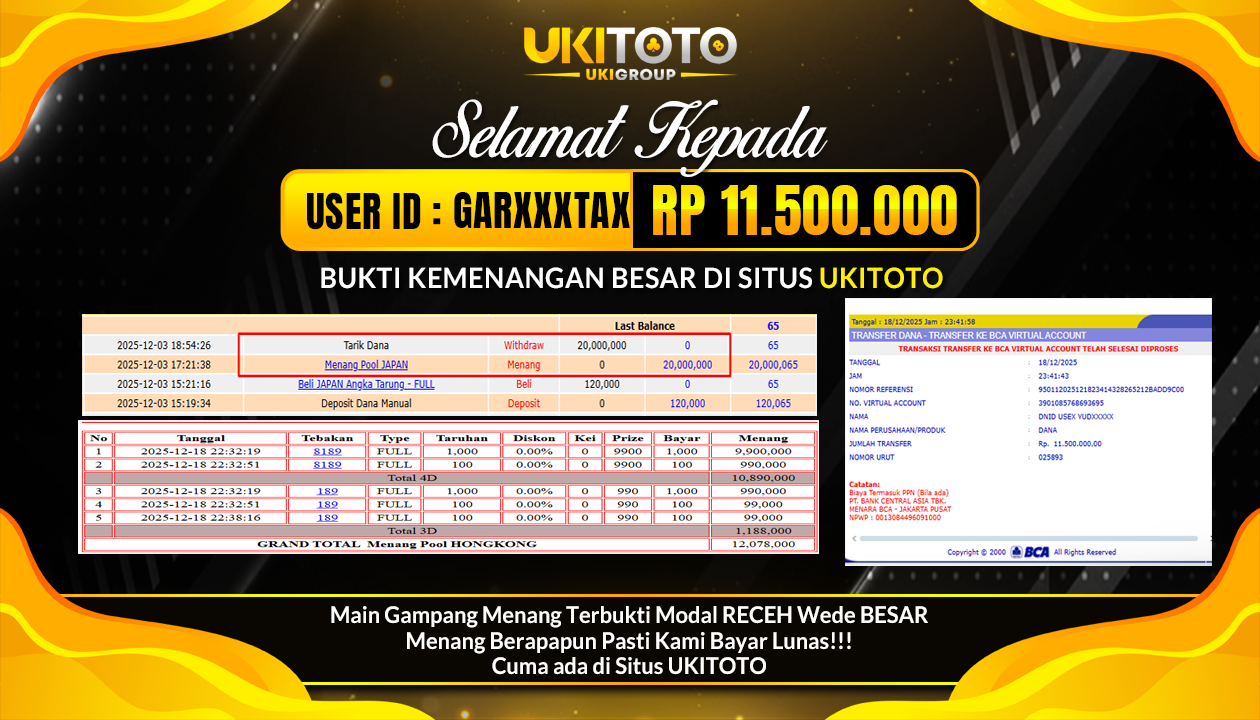 Selamat kepada User id : GARXXXTAX Telah berhasil mendapatkan kemenangan besar pada permainan JACKPOT TOGEL PASARAN HONGKONG LOTTO Rp.11,500.000, Setelah mengisi formulir withdraw dengan kurung waktu hanya 5 – 10 menit pihak UKITOTO sudah melakukan transfer kepada pemilik Userid dan dana sudah dapat di cairkan oleh pemenang. Bukti pembayaran yang kami berikan merupakan bukti pembayaran yang SAH / VALID yang langung di dapatkan melaui tanda transfer transaksi dari Bank yang di tuju. Kami mengucapakan banyak Terima Kasih Kepada pemenang karena sudah mempercayakan kami sebagai Bandar Tepercaya yang membayar semua kemenangan member hingga lunas.