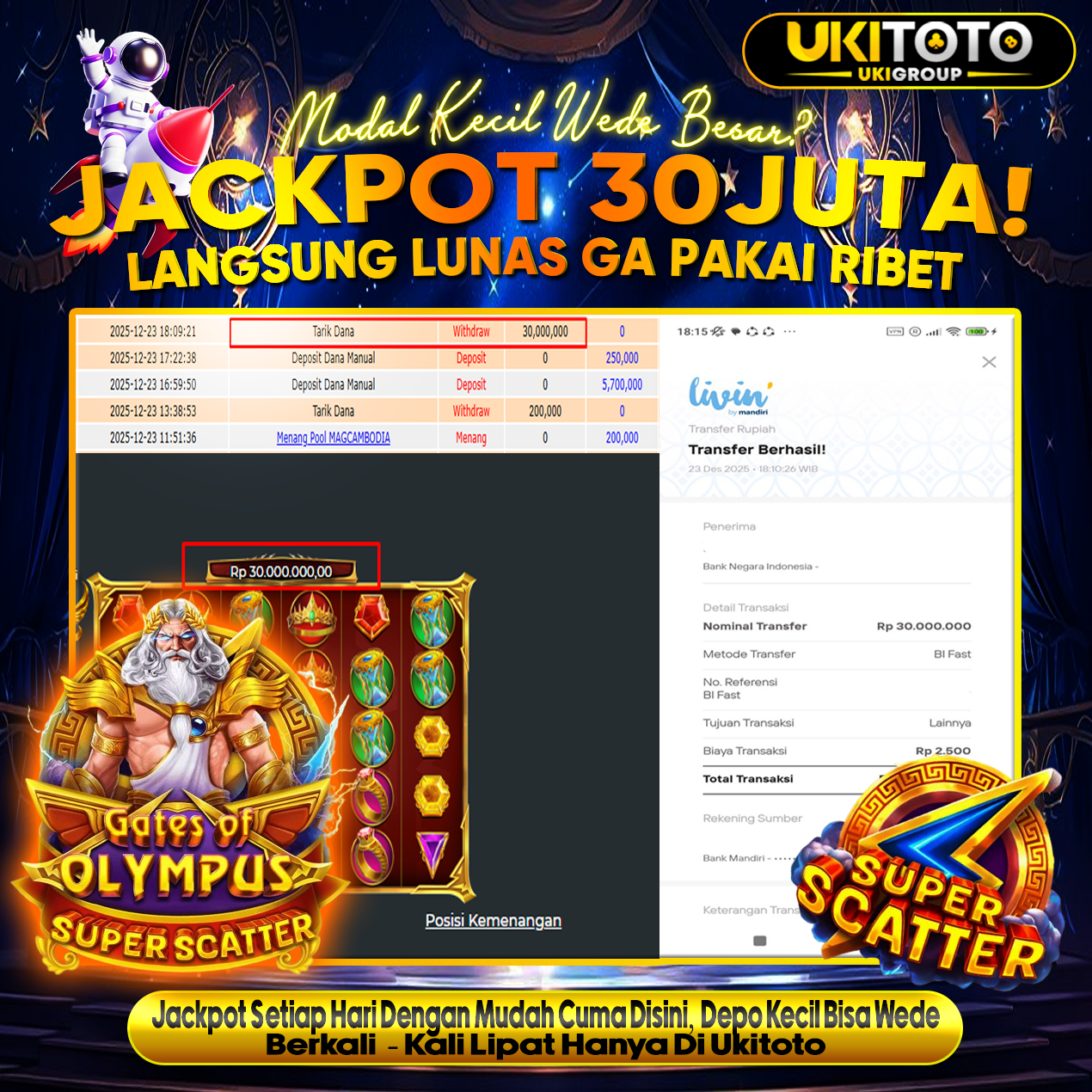 Selamat kepada User id : JORXXX88 Telah berhasil mendapatkan kemenangan besar pada permainan JACKPOT SLOT GATES OF OLYMPUS SUPER SCATTER Rp.30,000.000, Setelah mengisi formulir withdraw dengan kurung waktu hanya 5 – 10 menit pihak UKITOTO sudah melakukan transfer kepada pemilik Userid dan dana sudah dapat di cairkan oleh pemenang. Bukti pembayaran yang kami berikan merupakan bukti pembayaran yang SAH / VALID yang langung di dapatkan melaui tanda transfer transaksi dari Bank yang di tuju. Kami mengucapakan banyak Terima Kasih Kepada pemenang karena sudah mempercayakan kami sebagai Bandar Tepercaya yang membayar semua kemenangan member hingga lunas.