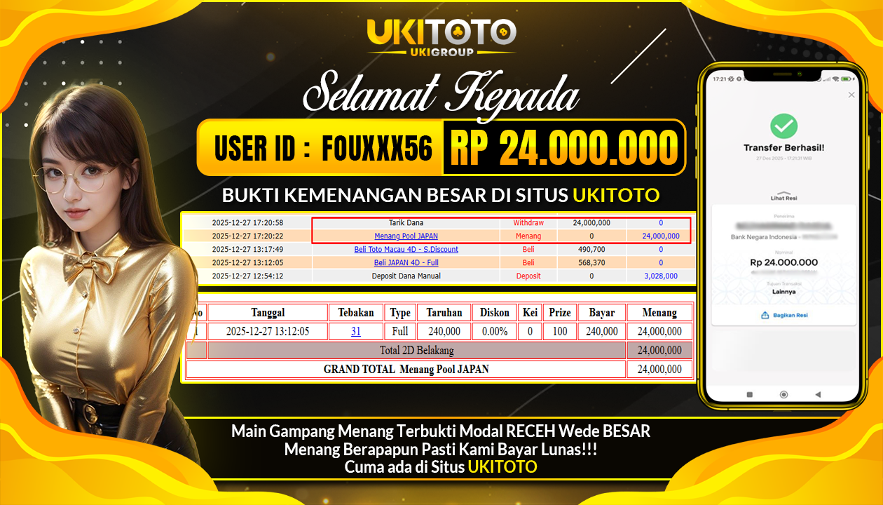 Selamat kepada User id : FOUXXX56 Telah berhasil mendapatkan kemenangan besar pada permainan JACKPOT TOGEL PASARAN JAPAN POOLS Rp.24,000.000, Setelah mengisi formulir withdraw dengan kurung waktu hanya 5 – 10 menit pihak UKITOTO sudah melakukan transfer kepada pemilik Userid dan dana sudah dapat di cairkan oleh pemenang. Bukti pembayaran yang kami berikan merupakan bukti pembayaran yang SAH / VALID yang langung di dapatkan melaui tanda transfer transaksi dari Bank yang di tuju. Kami mengucapakan banyak Terima Kasih Kepada pemenang karena sudah mempercayakan kami sebagai Bandar Tepercaya yang membayar semua kemenangan member hingga lunas