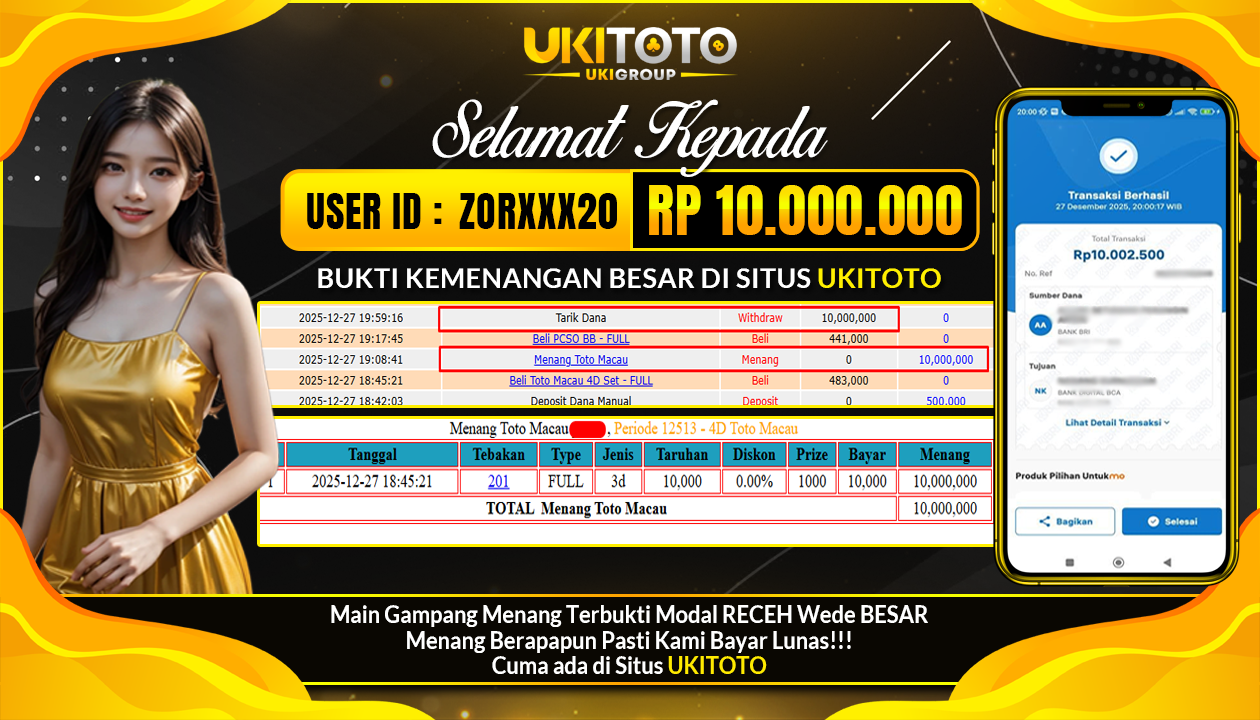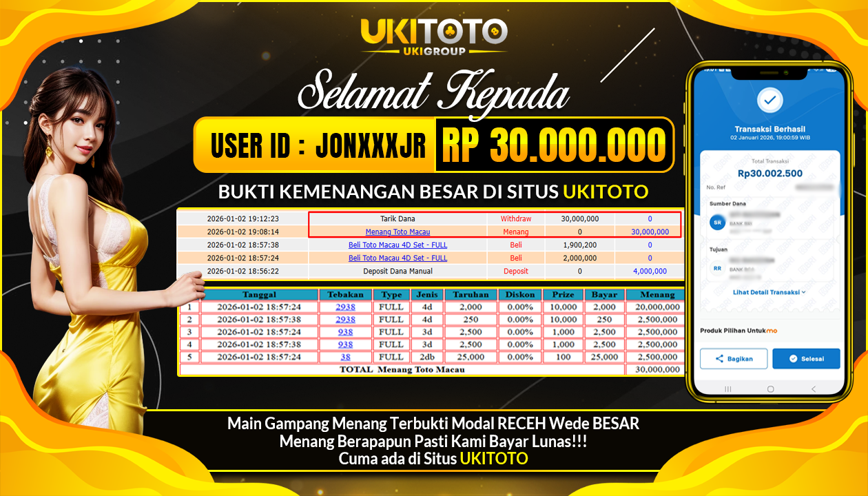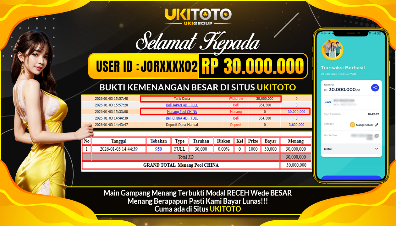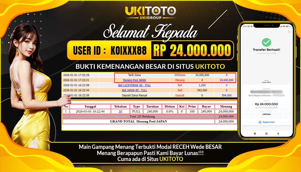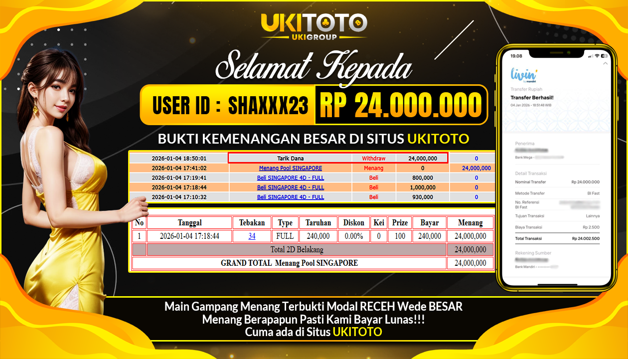 Selamat kepada User id : SHAXXX23 Telah berhasil mendapatkan kemenangan besar pada permainan JACKPOT TOGEL PASARAN SINGAPORE POOLS Rp.24,000.000 , Setelah mengisi formulir withdraw dengan kurung waktu hanya 5 โ 10 menit pihak UKITOTO sudah melakukan transfer kepada pemilik Userid dan dana sudah dapat di cairkan oleh pemenang. Bukti pembayaran yang kami berikan merupakan bukti pembayaran yang SAH / VALID yang langung di dapatkan melaui tanda transfer transaksi dari Bank yang di tuju. Kami mengucapakan banyak Terima Kasih Kepada pemenang karena sudah mempercayakan kami sebagai Bandar Tepercaya yang membayar semua kemenangan member hingga lunas